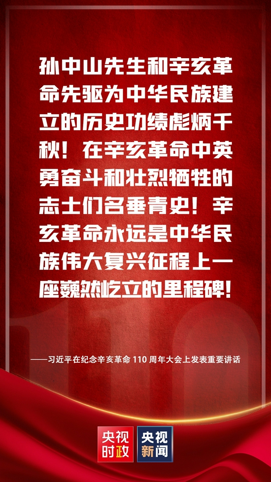纪念辛亥革命110周年大会10月9日上午在北京人民大会堂隆重举行。中共中央总书记、国家主席、中央军委主席习近平出席大会并发表重要讲话。