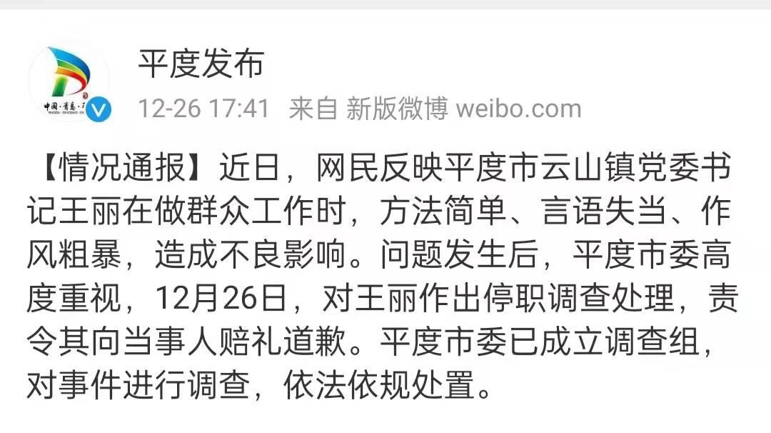 近日,网民反映平度市云山镇党委书记王丽在做群众工作时,方法简单、言语失当、作风粗暴,造成不良影响。问题发生后,平度市委高度重视,12月26日,对王丽作出停职调查处理,责令其向当事人赔礼道歉。平度市委已成立调查组,对事件进行调查,依法依规处置。