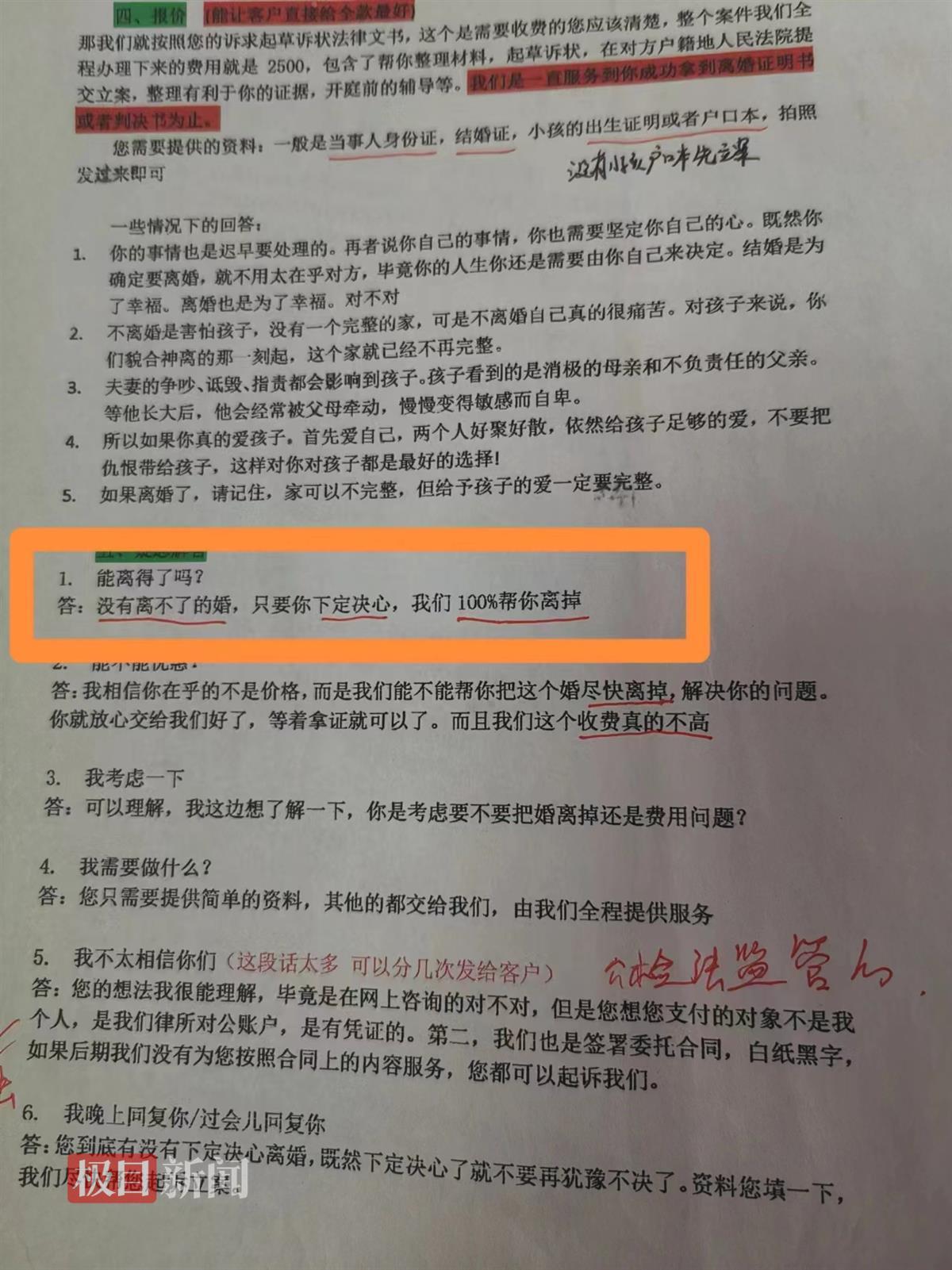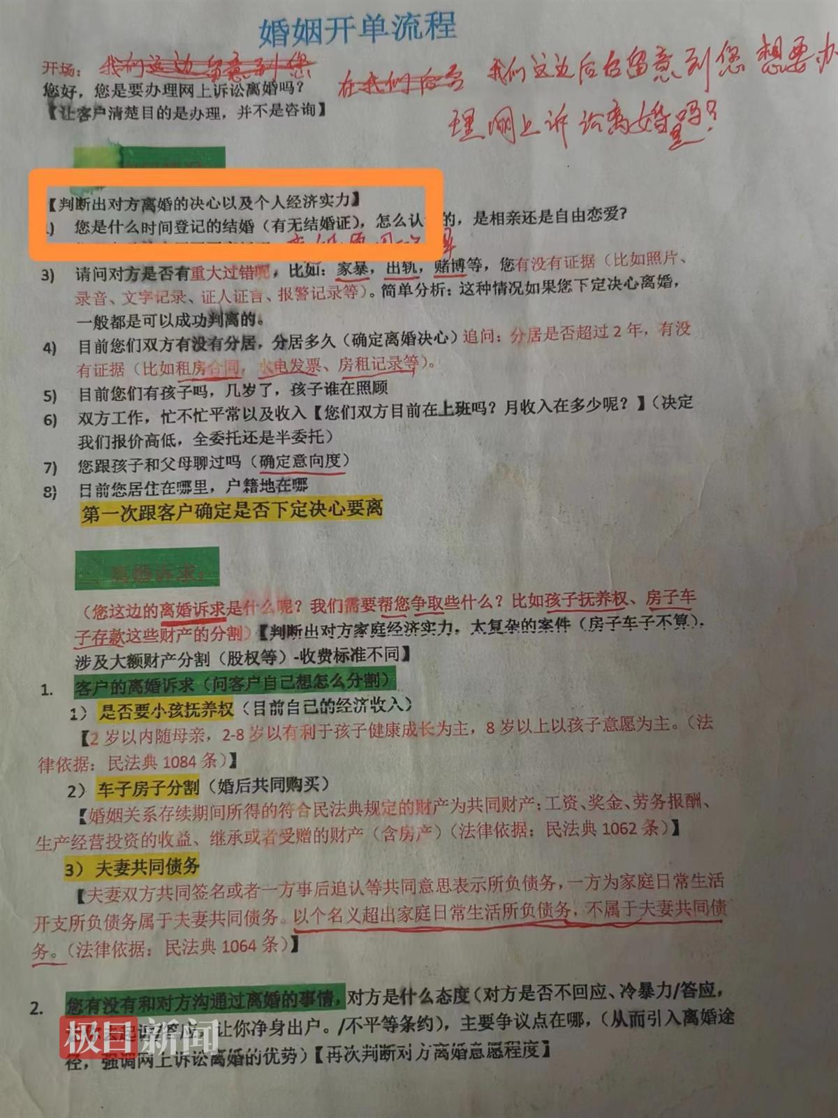 检查中,执法人员在该公司电脑中发现了“出轨”“赌博”“感情破裂”“起诉抚养费”等多个文件夹,还有一整套“营销话术”。例如,在《婚姻开单流程》中,明确写道,开场后需要询问登记结婚的时间、离婚原因、是否有证据以及双方工作和收入。在这一条款中,有一行字注明:判断出对方离婚的决心以及个人经济实力。