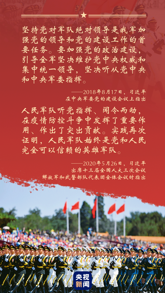 原标题:建成世界一流,习近平擘画强军路 军旗猎猎,军歌嘹亮。 1927年8月1日,伴着南昌城头响起的枪声,一支新型人民军队在经历了数千年沧海桑田的中华大地上诞生。 93年来,人民军队听党指挥、不辱使命,革命军人信念坚定、顽强战斗,取得了一个又一个辉煌胜利。 ![]() 党在新时代的强军目标是建设一支听党指挥、能打胜仗、作风优良的人民军队,把人民军队建设成为世界一流军队。 ![]() 党对军队的绝对领导是人民军队的建军之本、强军之魂。 习近平主席在总结我们党建军治军经验基础上深刻指出:“党指挥枪是保持人民军队本质和宗旨的根本保障,这是我们党在血与火的斗争中得出的颠扑不破的真理。” 从北国边疆到岭南大地,从大漠戈壁到东海之滨,无论走到哪里,习主席都对铸牢军魂反复强调、再三叮嘱。 ![]() 建军93年来,人民军队始终与党同心同德、步调一致,无论面临什么样的风险、诱惑和干扰,都矢志不渝听党话跟党走,以实际行动彰显对党的绝对忠诚。 新冠肺炎疫情发生后,全军部队坚决听从习主席指挥,闻令而动、勇挑重担,不负重托、不辱使命。从1月24日除夕夜开始,军队先后派出3批共4000多名医护人员驰援武汉,形成了前方指导组、联勤保障部队、一线医护人员的支援力量体系,为打赢疫情防控人民战争、总体战、阻击战作出突出贡献。 ![]() 7月以来,强降雨导致我国南方多地出现内涝、山洪等灾害。人民军队召之即来,火速集结,驰援抗洪一线。第一时间封堵管涌、保堤护圩、查巡险情,保护人民群众生命财产的安全。 ![]() ![]() “人民军队永远是战斗队,人民军队的生命力在于战斗力。” 这是习近平主席回顾人民军队光辉历史作出的科学结论。 能打仗、打胜仗,是党和人民对军队的根本要求,是军队使命职责之所在、军队存在的根本价值之所在。 进入新时代,习主席反复强调:从实战需要出发从难从严训练部队,坚持仗怎么打兵就怎么练,打仗需要什么就苦练什么。 ![]() 召之即来、来之能战、战之必胜。 对军队建设,习主席念兹在兹的就是实战化军事训练。在破浪航行的战舰上,习主席登甲板、进舱室,深入战位了解训练;在呵气成霜的戈壁滩上,习主席冒严寒、迎朔风,视察空军某试验训练基地;在硝烟未散的演习场上,习主席坐进装甲指挥车,详细询问装备性能…… ![]() 训令如铁,使命如山,号角催征。近年来,实战化军事训练热潮在全军持续兴起。陆军的“跨越” “火力”、海军的“机动” “蓝鲸”、空军的“金头盔” “金飞镖”、火箭军的“天剑”等系列演习,对抗性一年比一年强,火药味一年比一年足,展现出新时代实战实训的新气象。 ![]() ![]() 军无法不立,法无严不威。依法治军、从严治军,是历史的昭示,是时代的选择,是现代化军队建设的普遍规律。 2012年12月,党的十八大闭幕后不久,习近平主席首次到基层部队视察时,就鲜明提出“依法治军、从严治军是强军之基”。自此,以强军目标为引领,人民军队依法治军、从严治军按下“快进键”,法治军队建设开创崭新局面。 ![]() 党的十八大以来,习近平主席站在历史和时代的制高点,宏伟擘画党和国家发展、强军兴军蓝图,从作风建设开局,以踏石留印、抓铁有痕的毅力,以滴水穿石、铁杵成针的坚韧,以百折不挠、一往无前的闯劲,正风肃纪、反腐惩恶。 浴火重生的人民军队,政治生态清朗、作风形象重塑、传统本色回归、军心士气凝聚、打赢能力跃升,开启了新时代波澜壮阔的新征程。 ![]() 征程万里,初心如磐。在以习近平同志为核心的党中央的坚强领导下,在习近平强军思想的科学指引下,坚定不移走中国特色强军之路,就一定能够实现全面建成世界一流军队的目标! |
